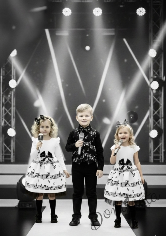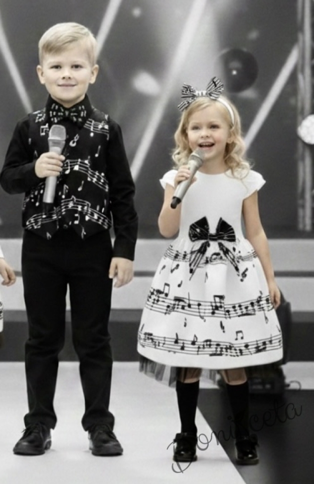 Празничен коплект от детска рокля в бяло с черни ноти и болеро в черно