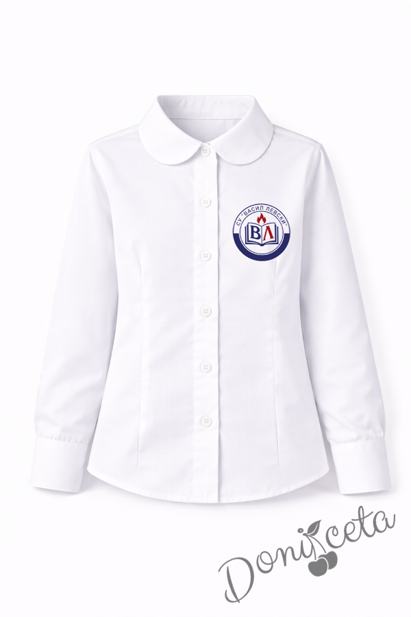 Детска риза за момиче в бяло с дълъг ръкав и лого по избор, подходяща е за ученическа униформа
