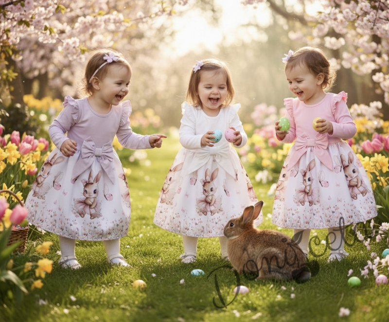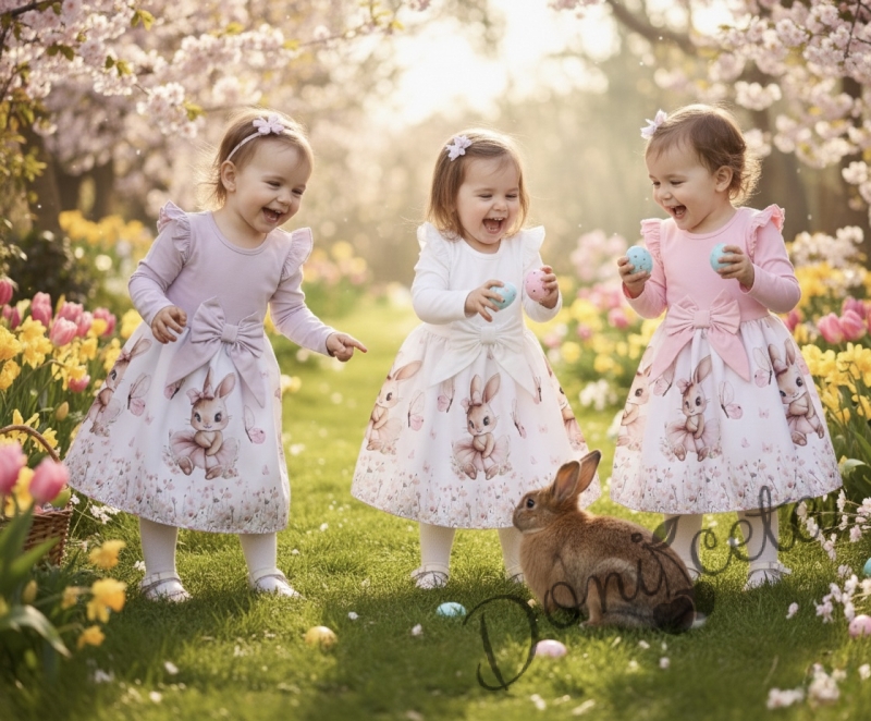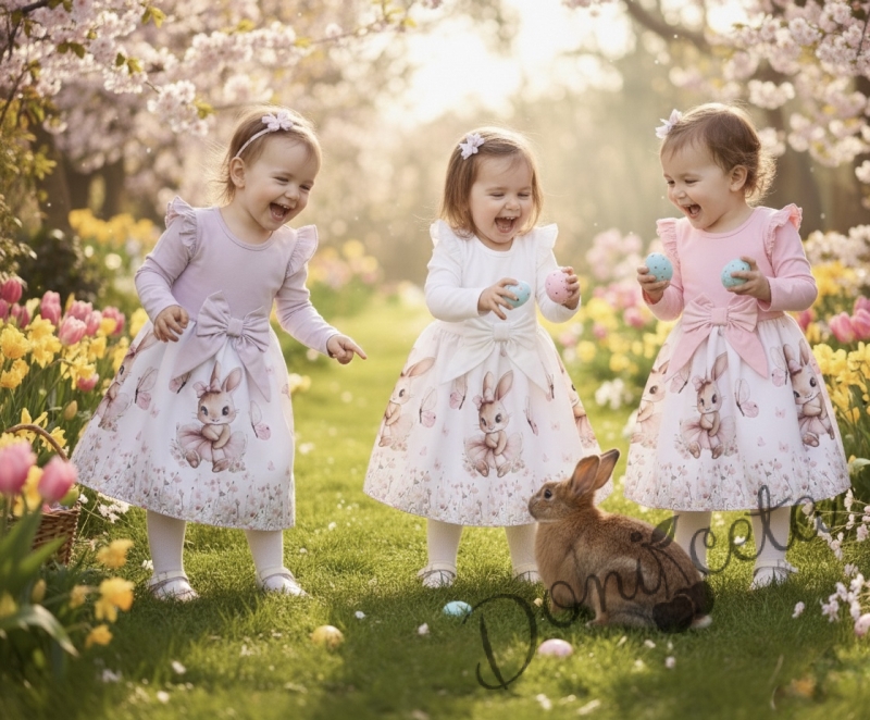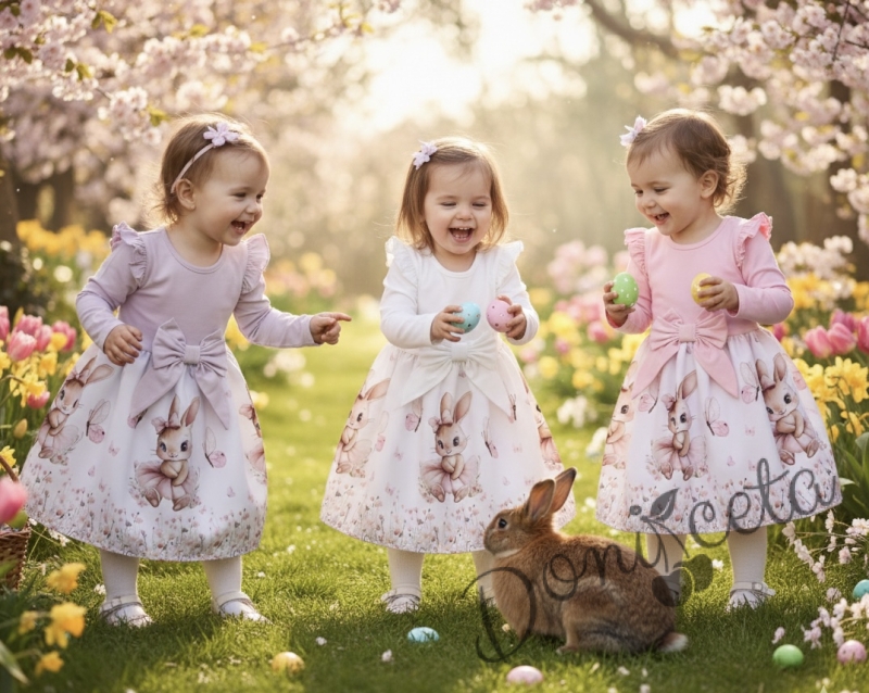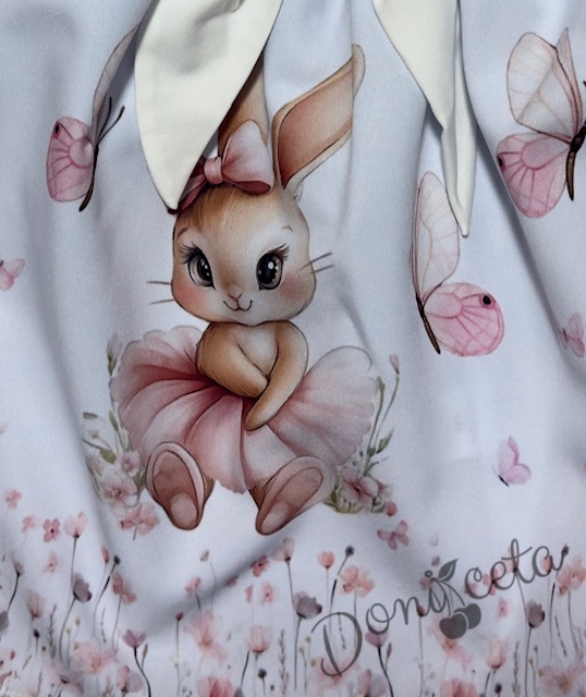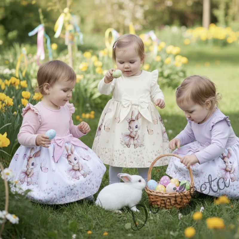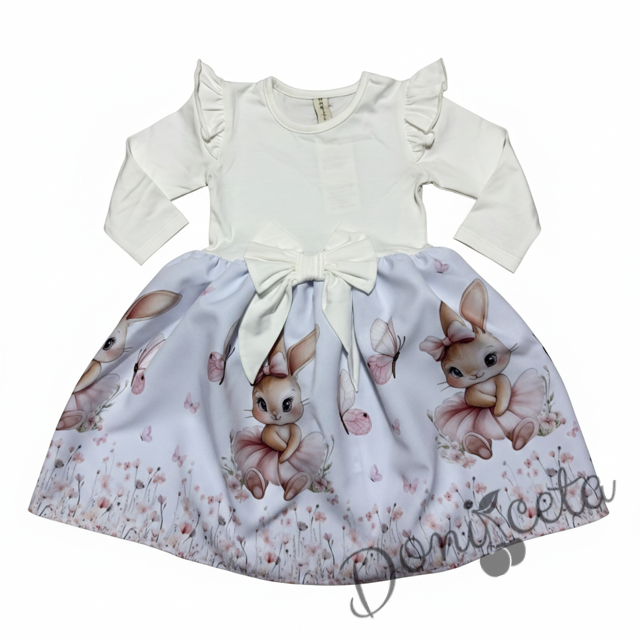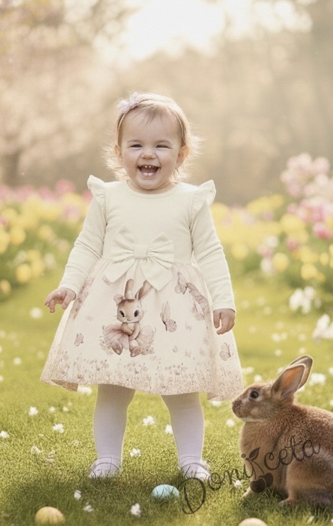Детска рокля с дълъг ръкав в екрю с къдрички, панделка и изображение на зайче-балерина
