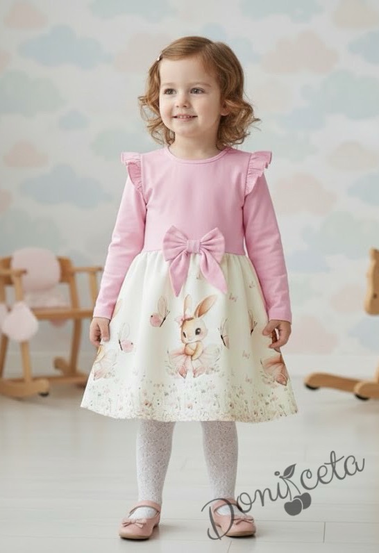 Детска рокля с дълъг ръкав в розово с къдрички, панделка и изображение на зайче-балерина