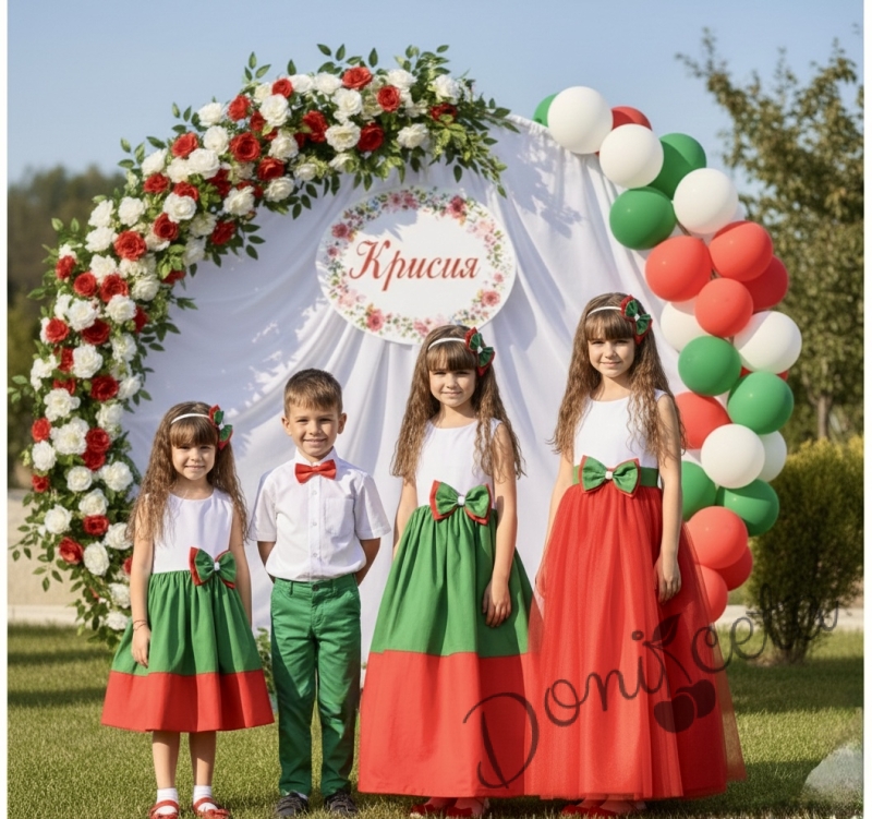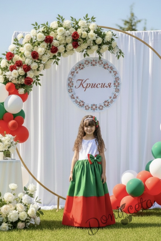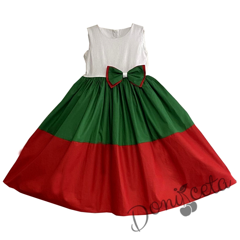 Детска дълга рокля в бяло, зелено и червено с панделка