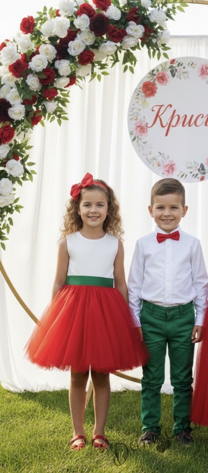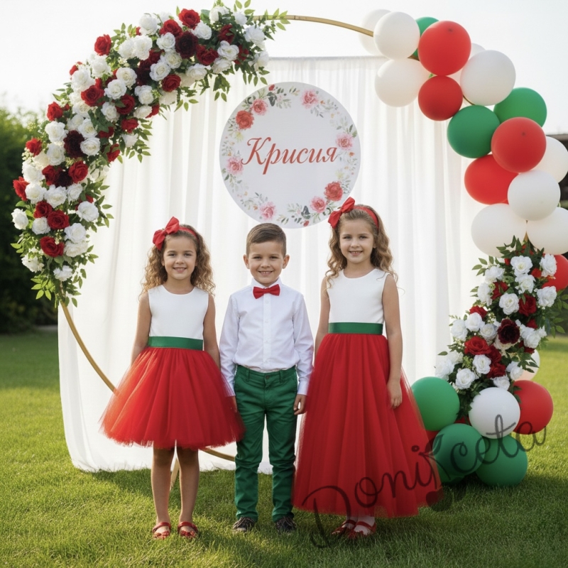 - Рокличката е без ръкав в горната част в бяло, на кръста е с пришито коланче в зелено с красива панделка, а надолу е с богат тюл в червено.