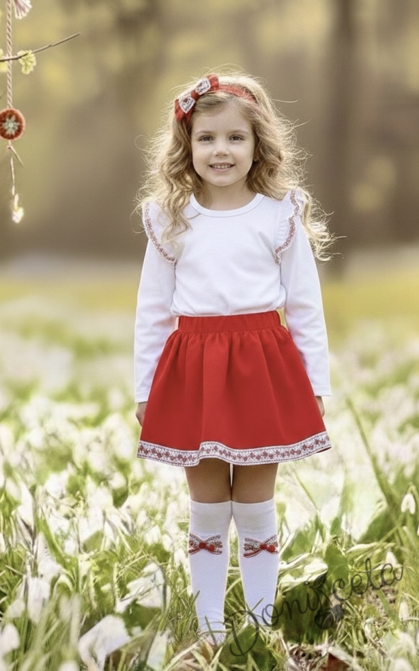 Комплект за момиче от 2 части- пола с етно мотиви и риза в бяло с червени къдрици