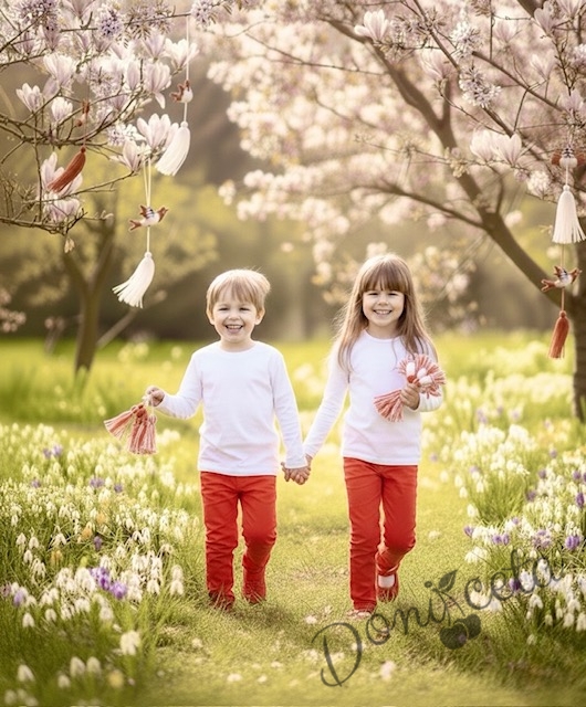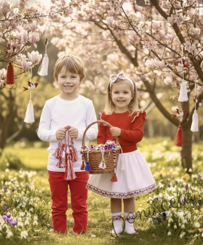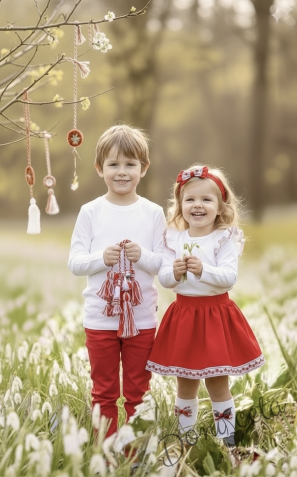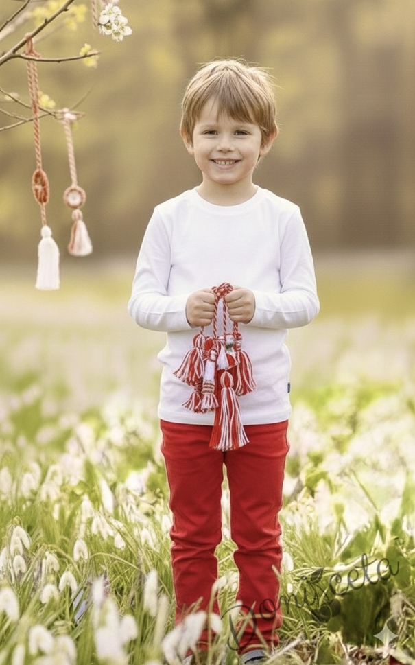 - Комплект от детска блузка в бяло за момче и прав панталон в червено.