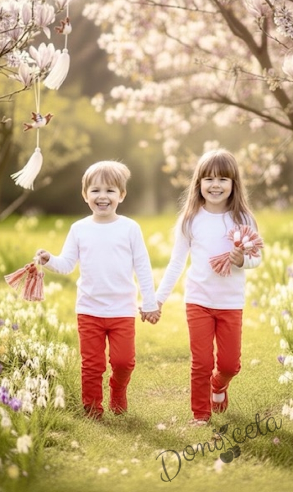 Комплект от детска блузка в бяло и панталон в червено за момче или момиче