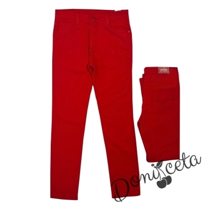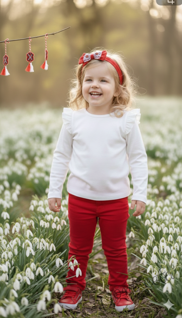 - Комплект от детска блузка в бяло с къдрички на рамената за момиче и прав панталон в червено.