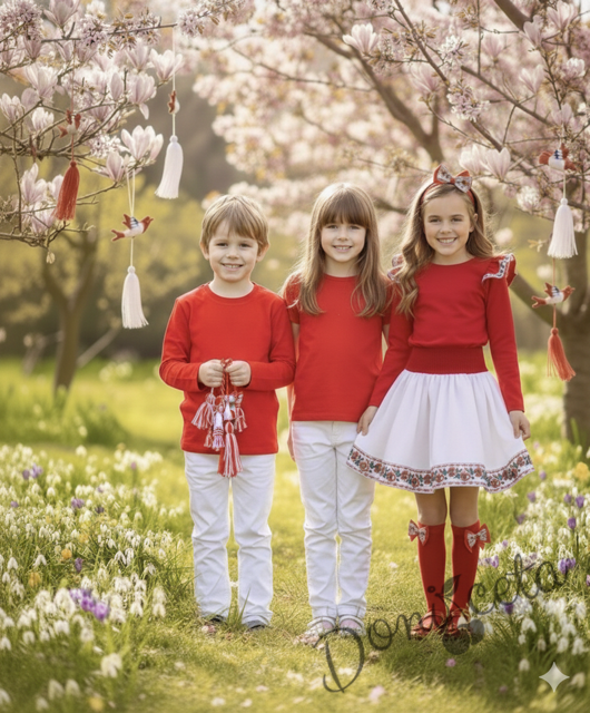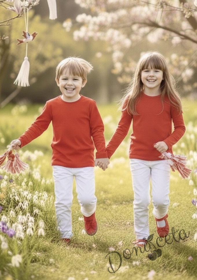 - Комплект от детска блузка в червено за момче или момиче /универсална/ и прав панталон в бяло.