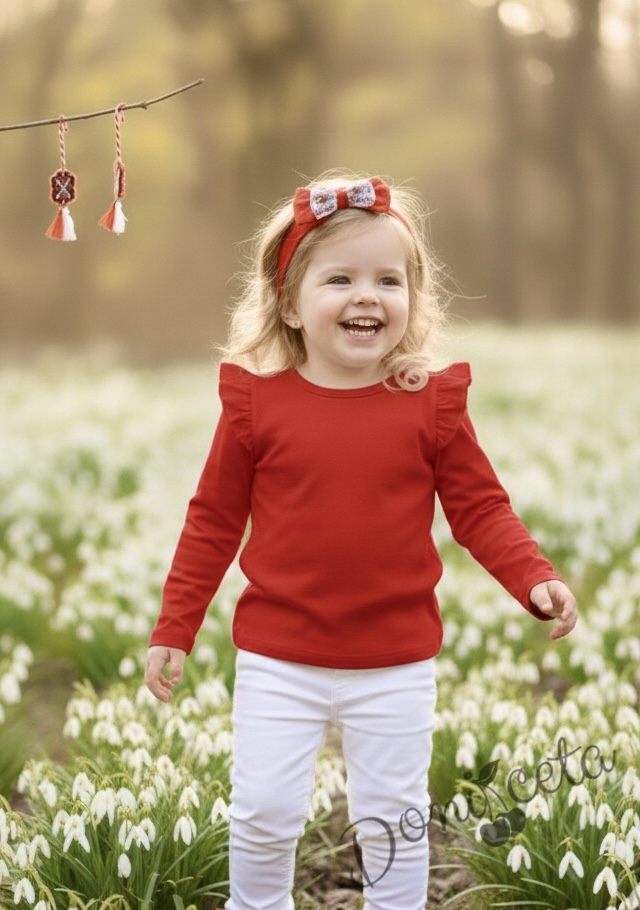 Комплект от детска блузка в червено с къдрички на раменете и панталон в бяло за момиче