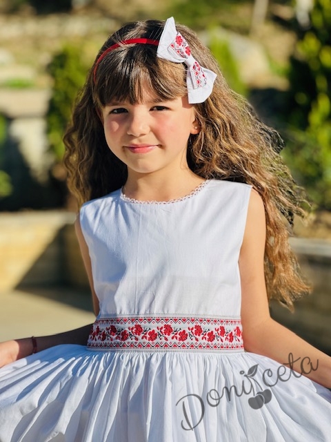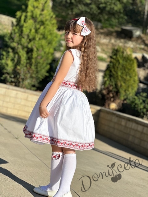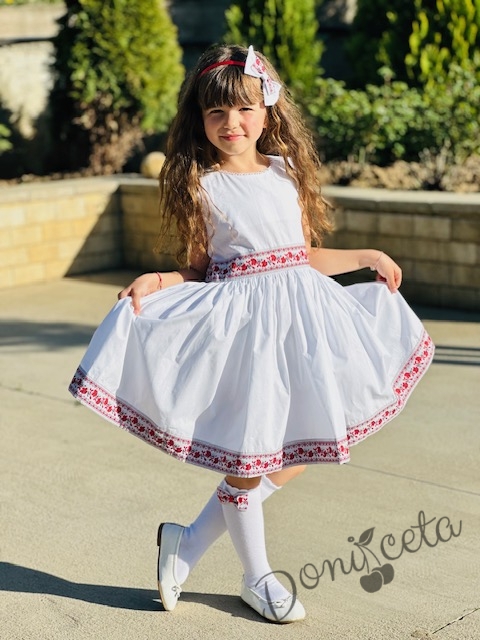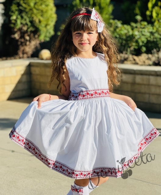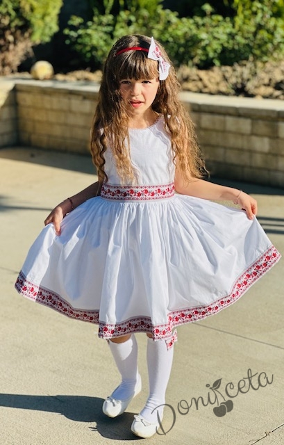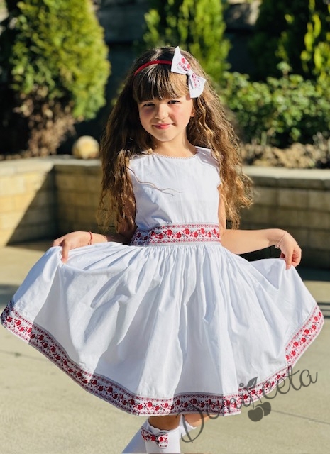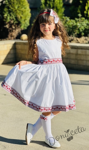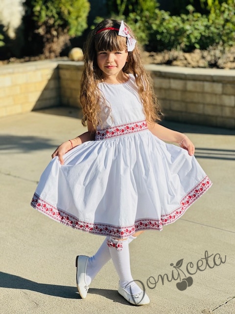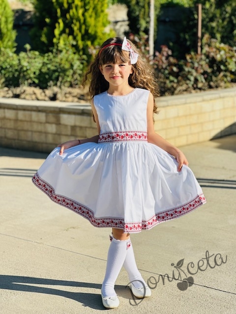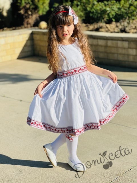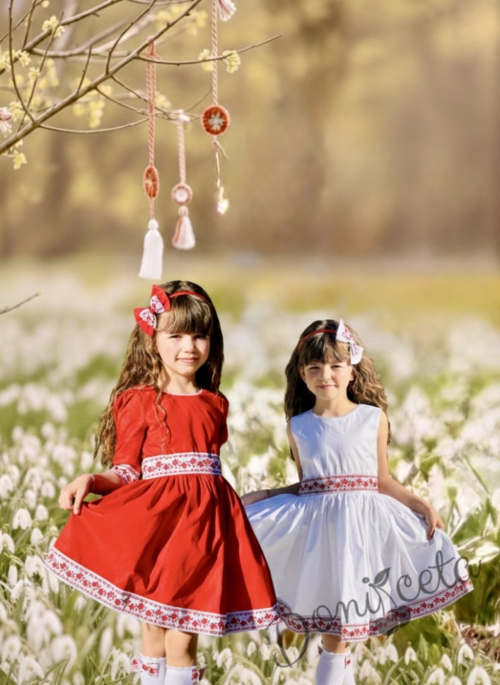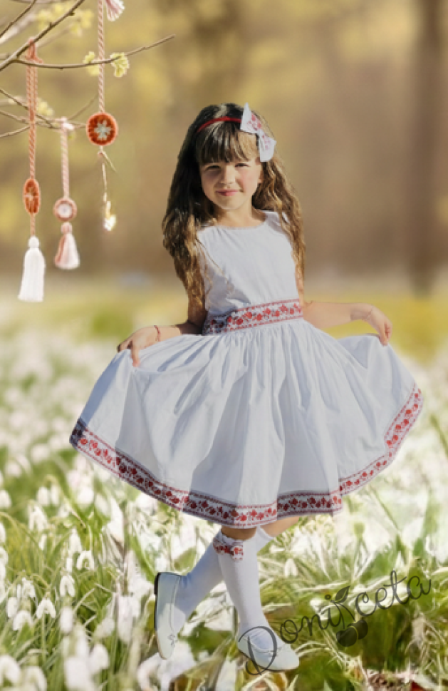 Начало БАБА МАРТА Детска рокля в бяло без ръкав с фолклорни и етно мотиви в червено