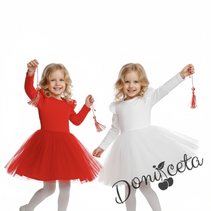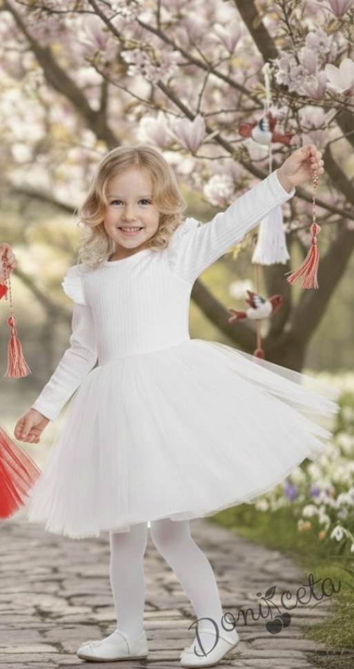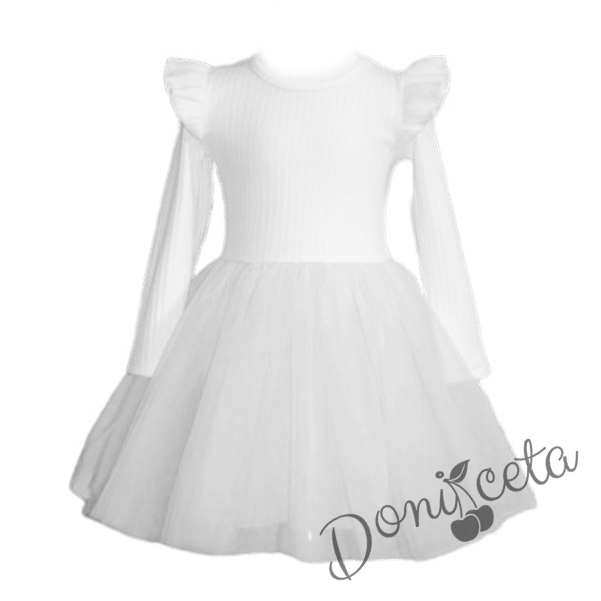 Детска бяла рокля с дълъг ръкав от трико рипс с къдрички на рамената и тюл Оливия