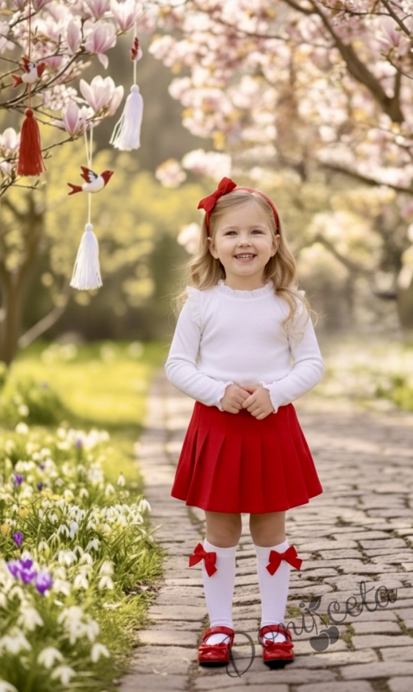 Комплект от пола Гери в червено, блуза в бяло с дълъг ръкав и чорапи с панделка