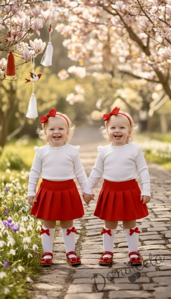 Комплект за момиче от блуза в бяло с майка и дъщеря и пола плисе в червено
