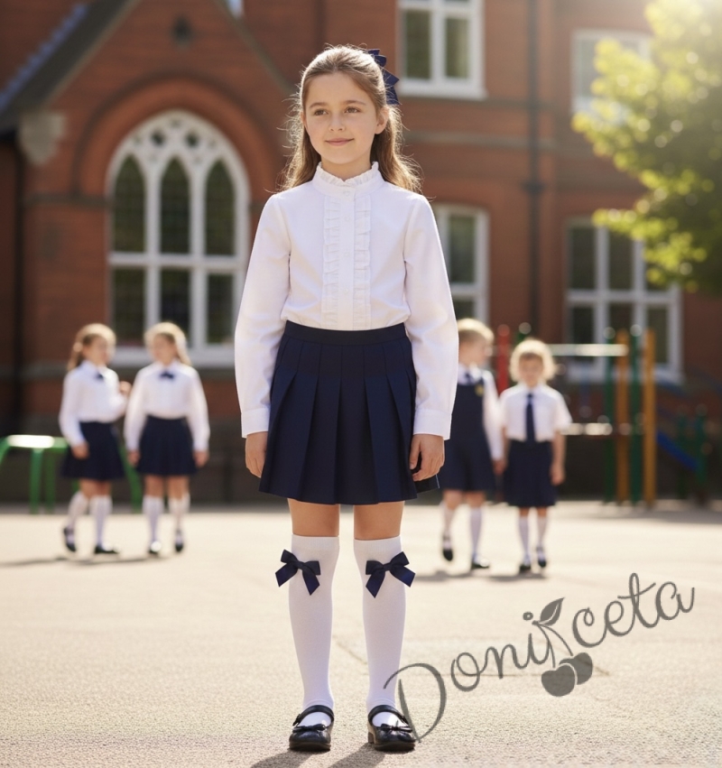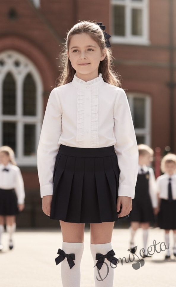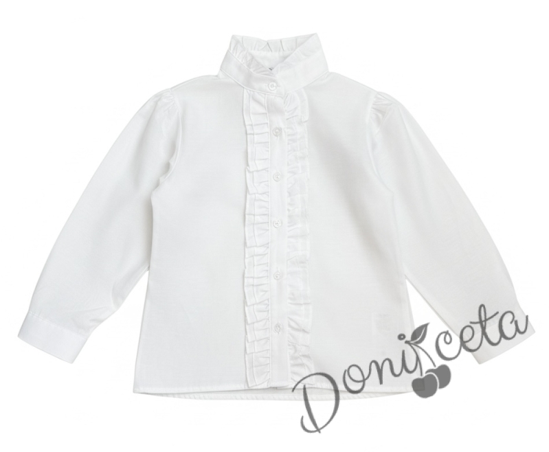 Детска риза в бяло за момиче с дълъг ръкав и къдрички с висока яка