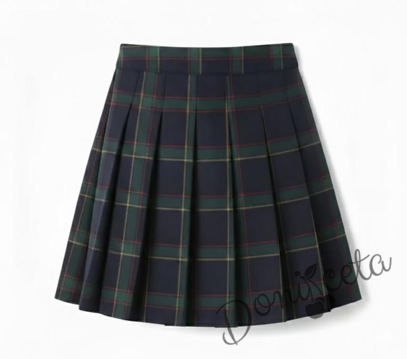 - Пола плисе в карирано тъмносиьо и зелено над коляното.