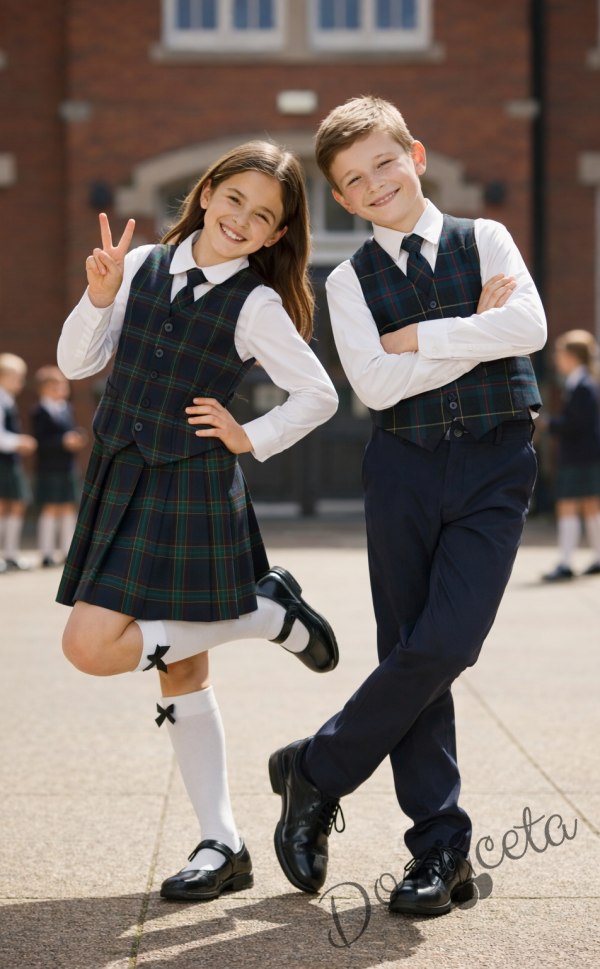 Комплект от 4 части карирана плисирана пола над коляното с бяла изчистена риза, карирана вратовръзка и карирано елече, подходящ и за ученическа униформа
