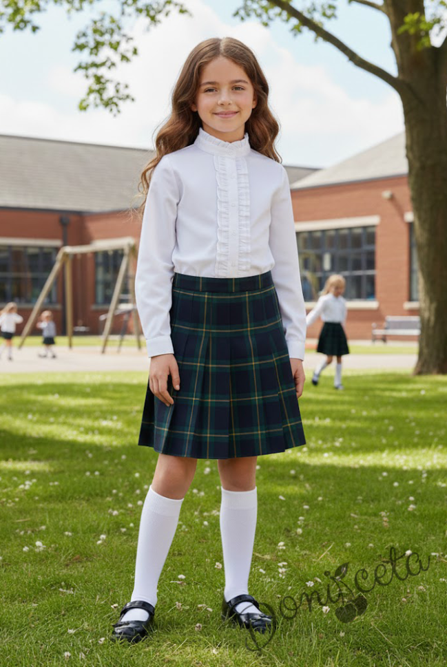 Начало УЧЕНИЧЕСКИ УНИФОРМИ Комплект от 2 части с бяла изчистена риза и карирана плисирана пола до коляното, подходящ и за ученическа униформа