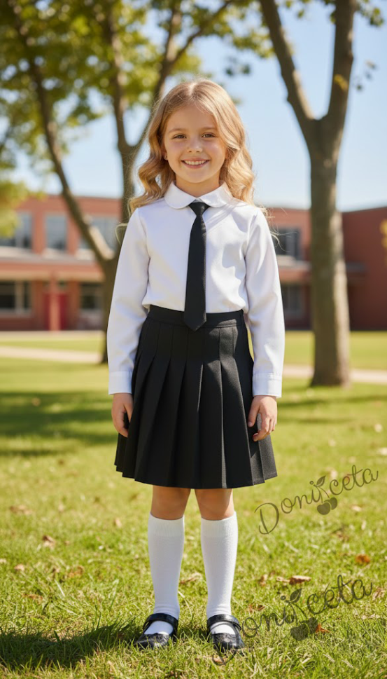 Комплект от 3 части пола плисе до коляното в черно, бяла изчистена риза и вратовръзка в черно, подходящ и за ученическа униформа