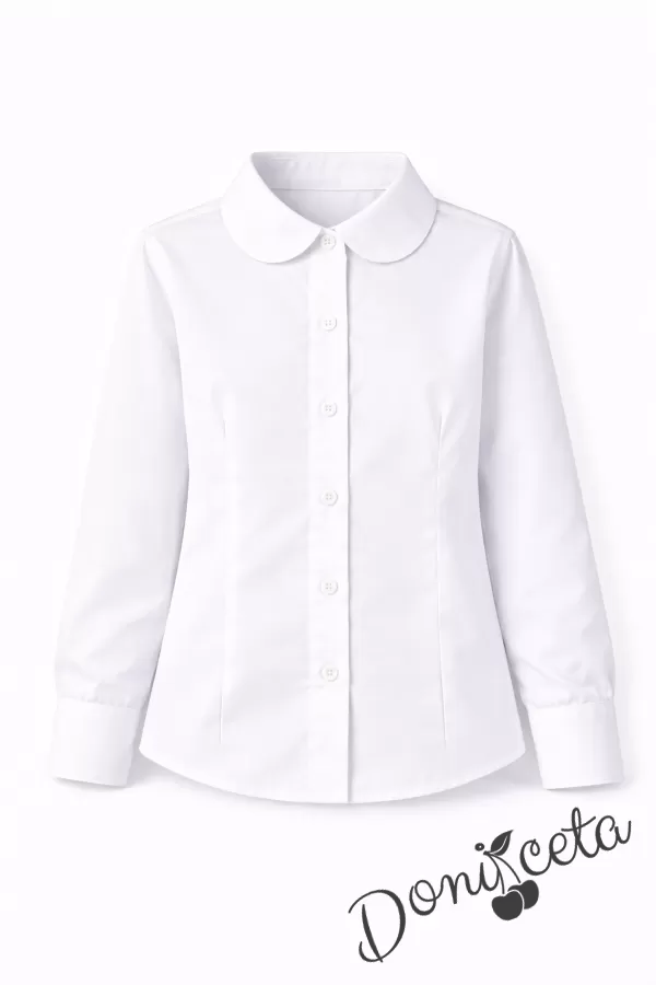 - Риза в бяло с дантела с дълъг ръкав и висока яка.