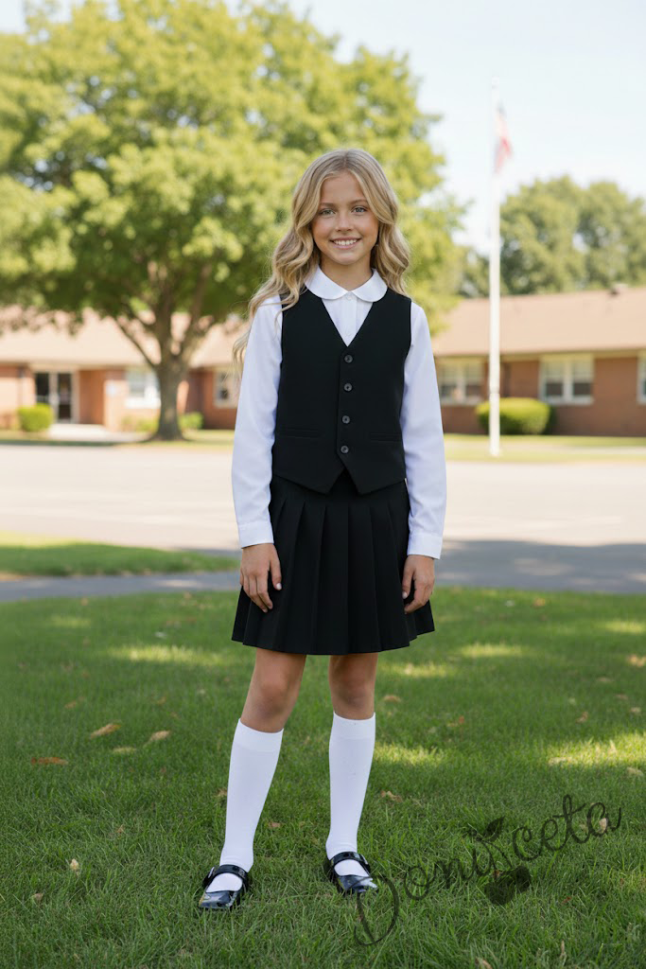 Начало УЧЕНИЧЕСКИ УНИФОРМИ Комплект от 3 части пола плисе до коляното в черно, бяла изчистена риза и елече в черно, подходящ и за ученическа униформа