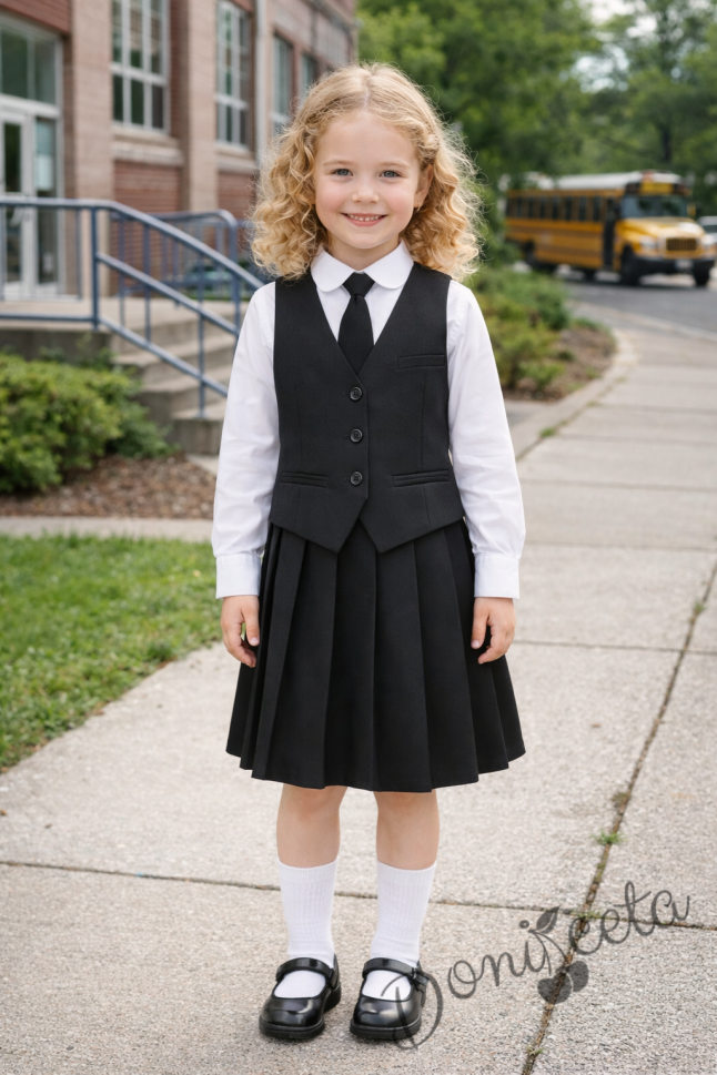 Комплект от 4 части черна плисирана пола до коляното с бяла изчистена риза, черна вратовръзка и черно елече, подходящ и за ученическа униформа