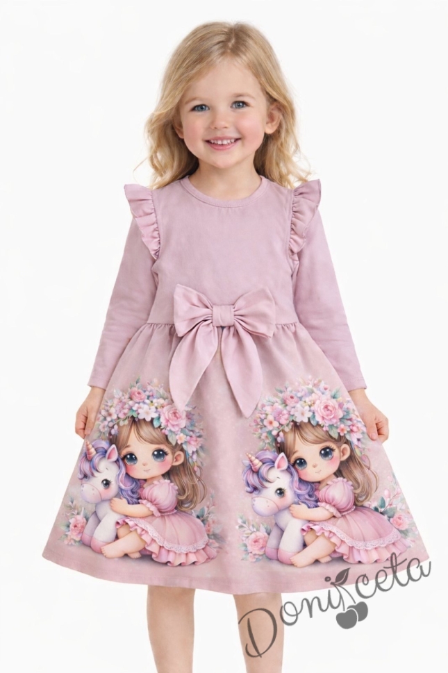 Детска рокля с дълъг ръкав в пепел от рози с къдрички, панделка и картинка