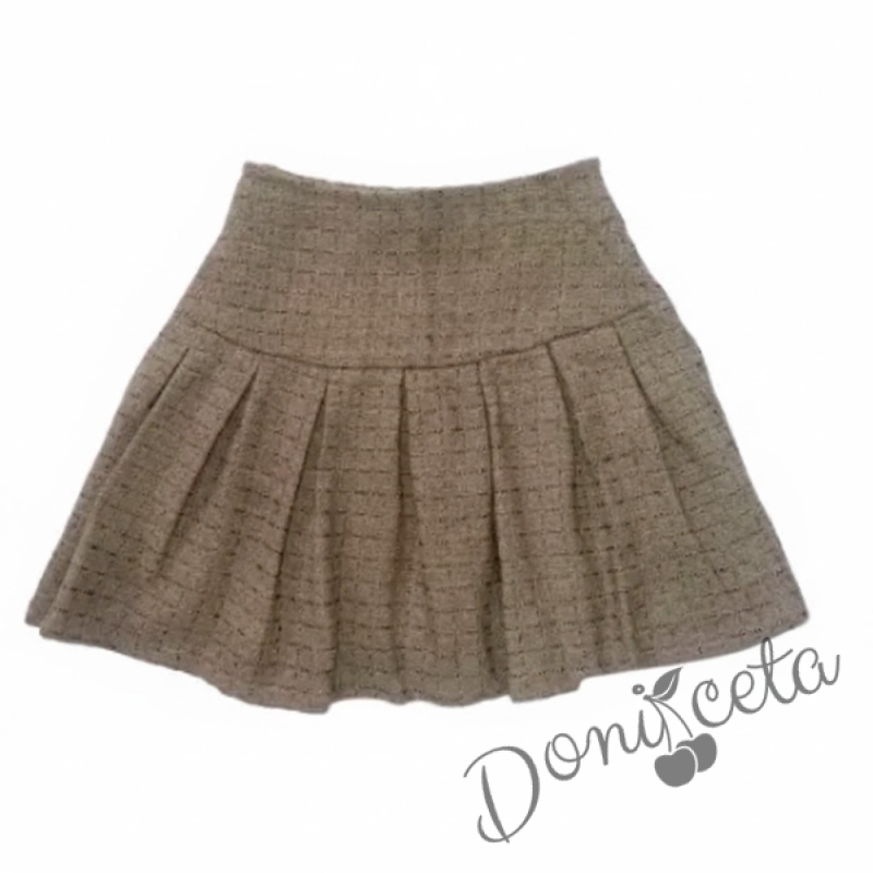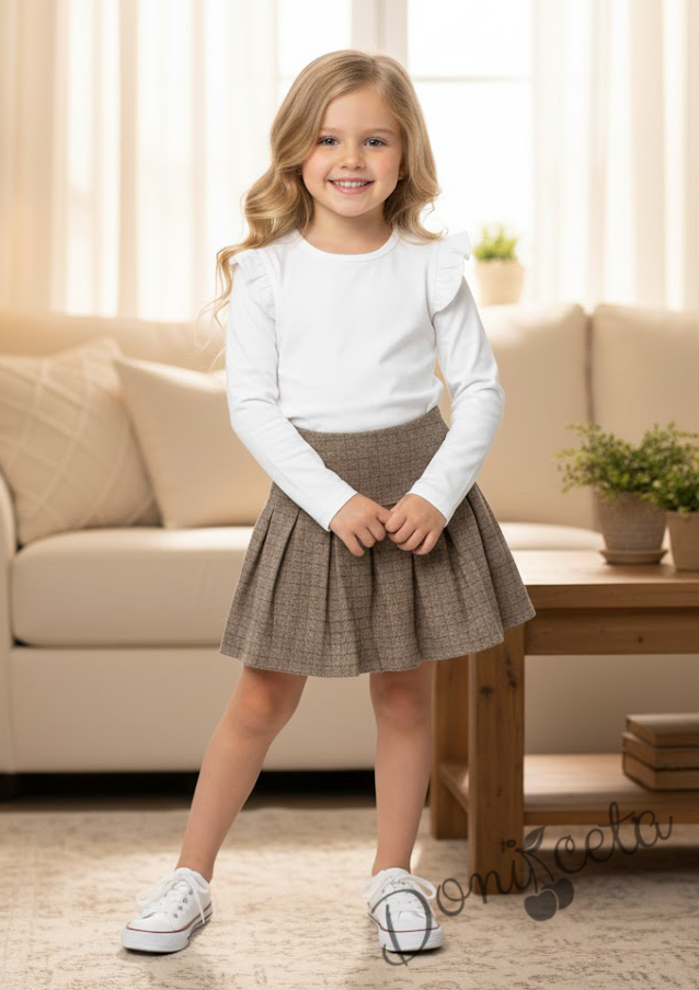 Комплект за момиче от 2 части- пола плисе в кафяво Лия и бяла блуза с дълъг ръкав и къдрички
