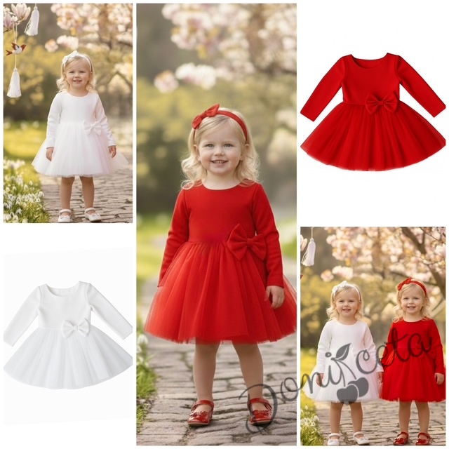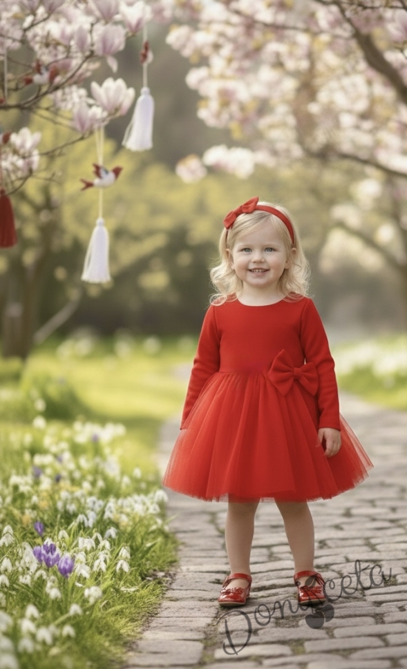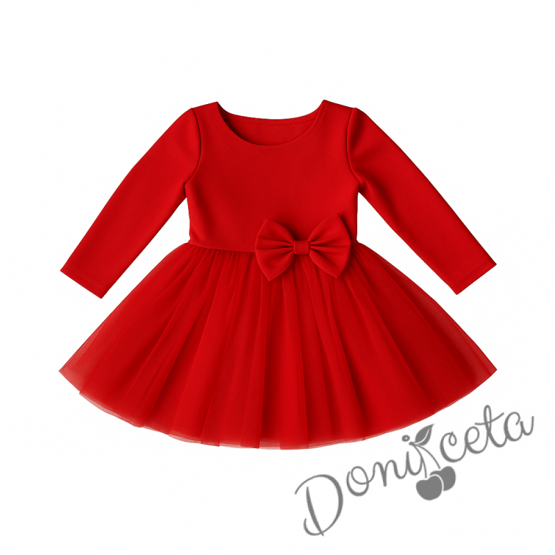 - Изключително красива и нежна рокля в червено с дълъг ръкав с богат тюл и панделка отпред.