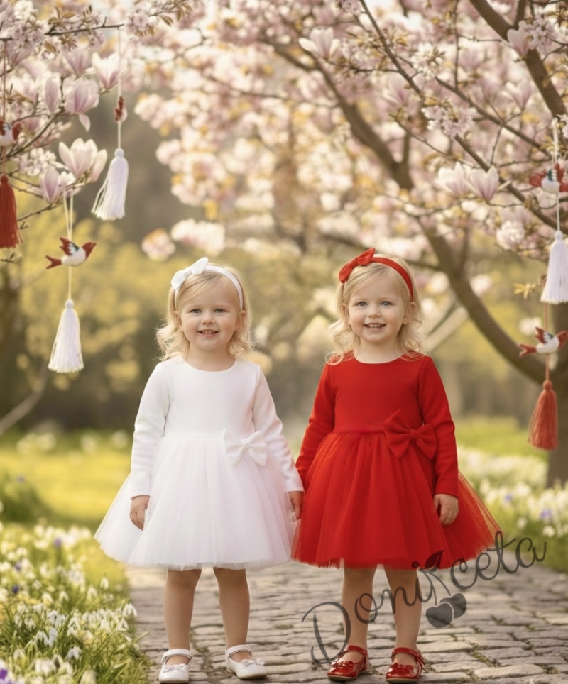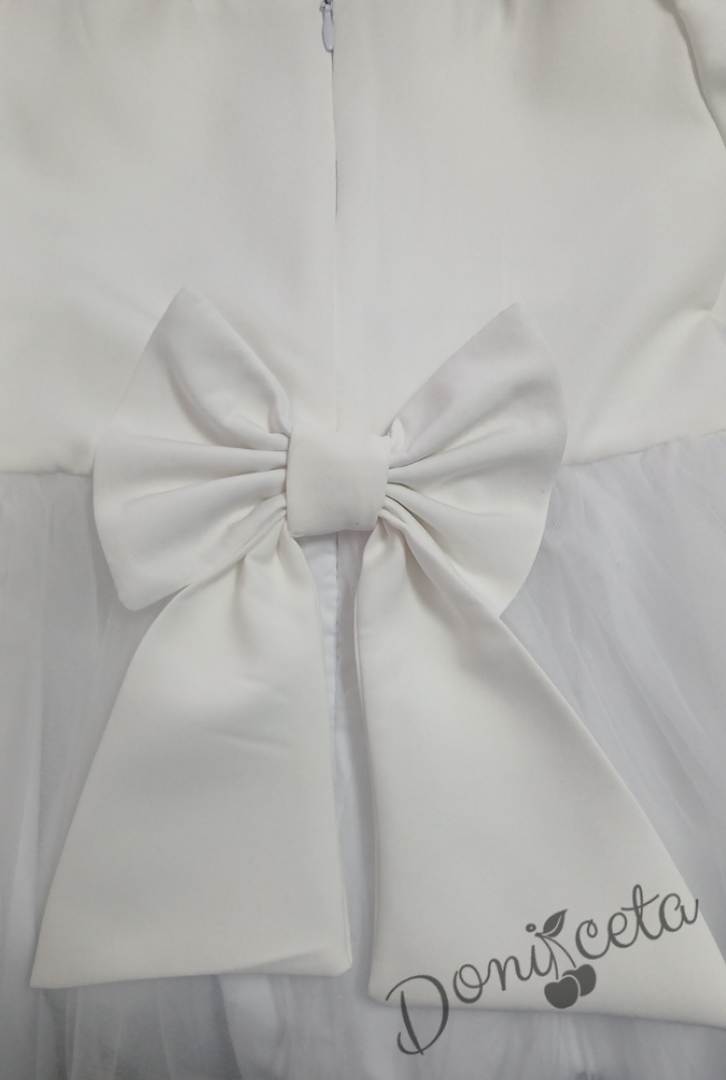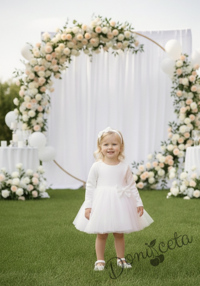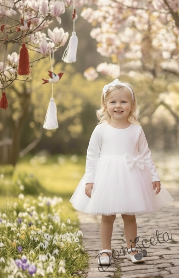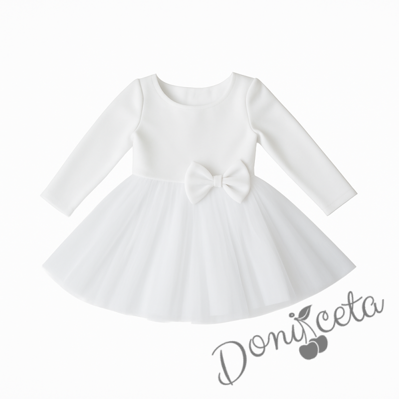 - Изключително красива и нежна рокля в бяло с дълъг ръкав с богат тюл и панделка отпред.