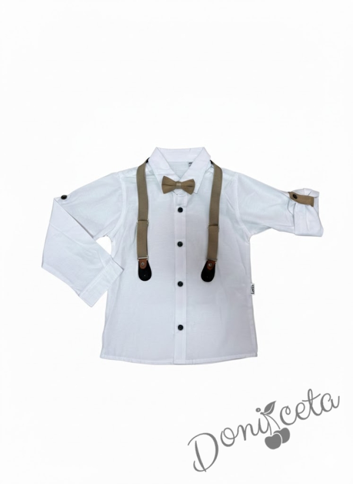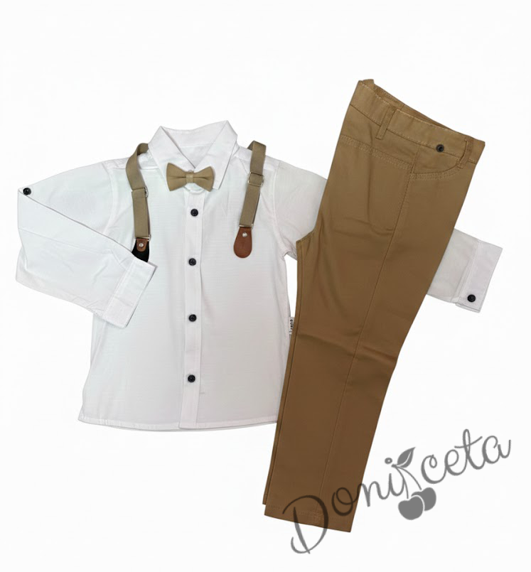 • Стилен комплект за момче с бяла риза, панталон в бежово, тиранти и папийонка.