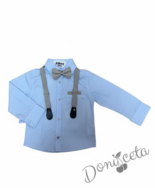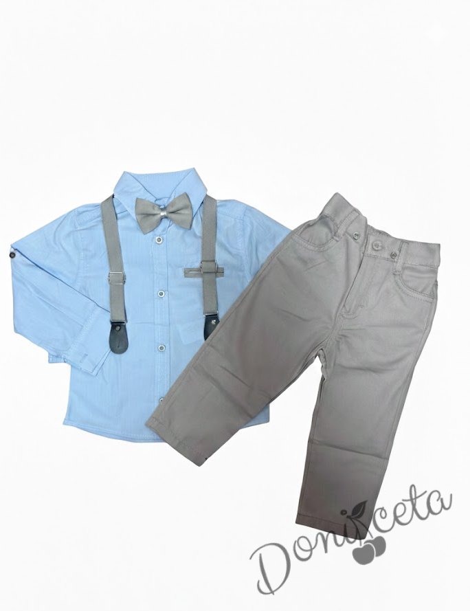 - Стилен комплект за момче с бяла риза, панталон в сиво, тиранти и папийонка.