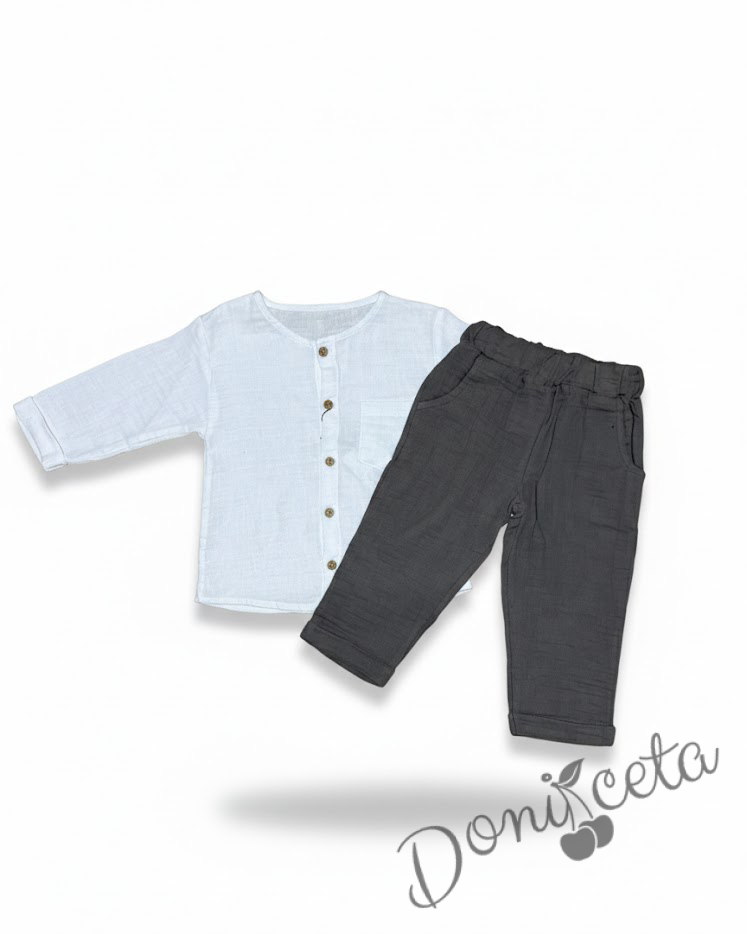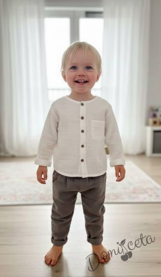 Начало МОМЧЕТА Комплект за момче от 2 части - риза с къс ръкав в бяло с панталон в кафяво
