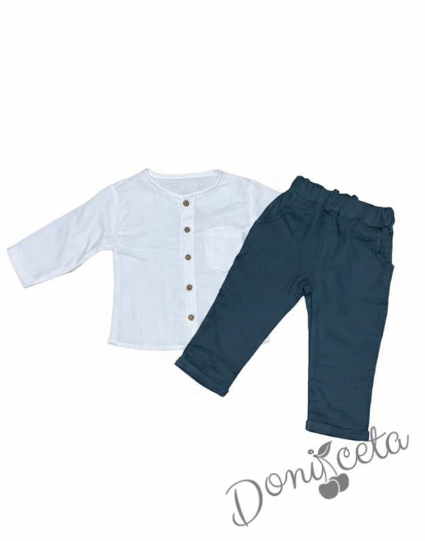 Комплект за момче от 2 части - риза с къс ръкав в бяло с панталон в петролено синьо