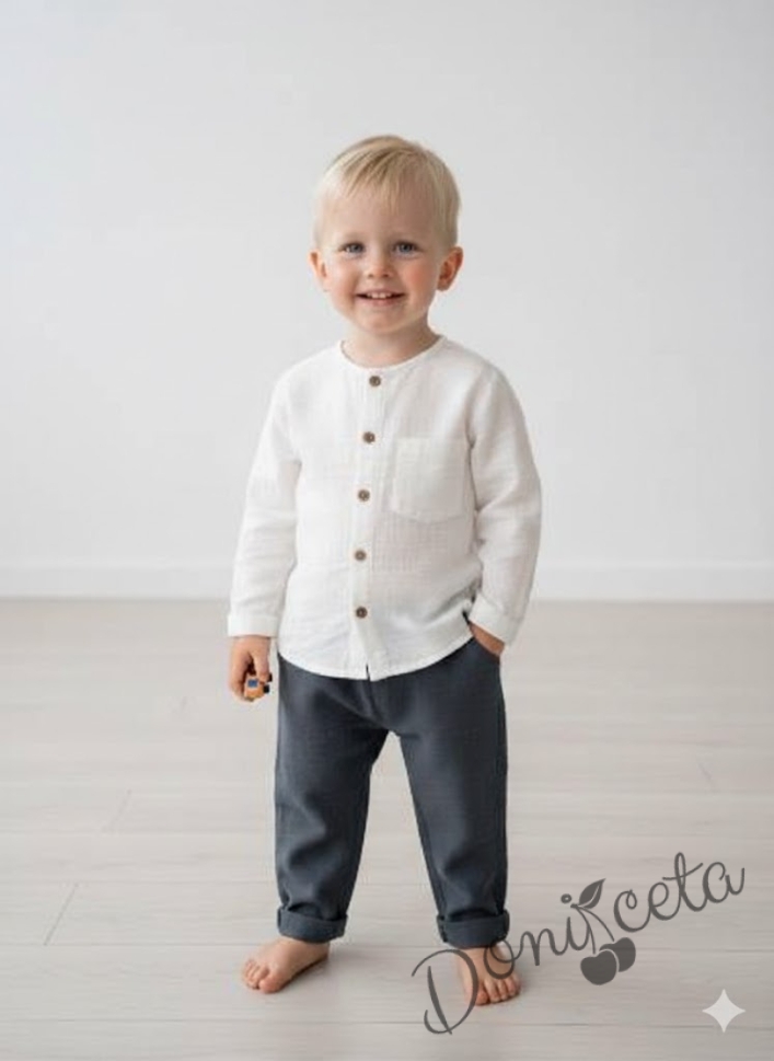 Летен комплект за момче риза с къс ръкав в бяло и дълги панталони в бежово