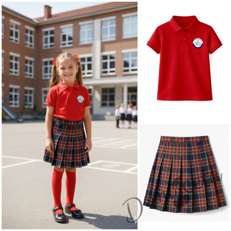 Начало УЧЕНИЧЕСКИ УНИФОРМИ Комплект от 2 части-червена тениска с яка и лого, съчетана с леко удължена плисиран пола в червено каре, подходящ и за ученическа униформа