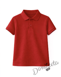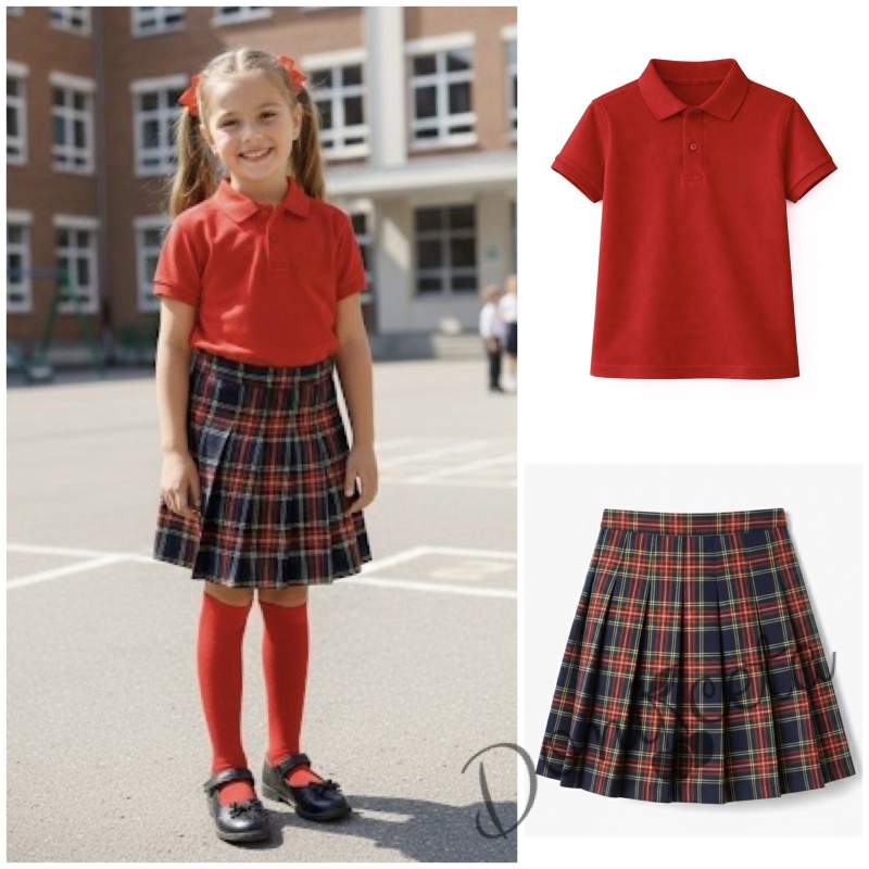 Комплект от 2 части-червена тениска с яка, съчетана с леко удължена плисиран пола в червено каре, подходящ и за ученическа униформа