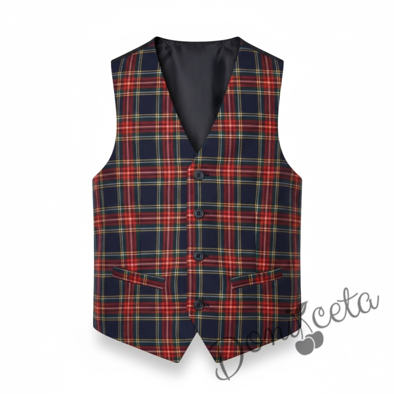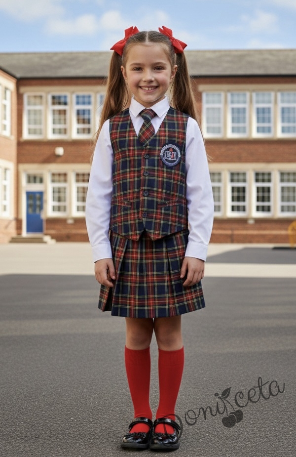 Комплект каре от 3 части- карирана плисирана пола леко удължена, карирана вратовръзка и карирано елече с лого, подходящ и за ученическа униформа