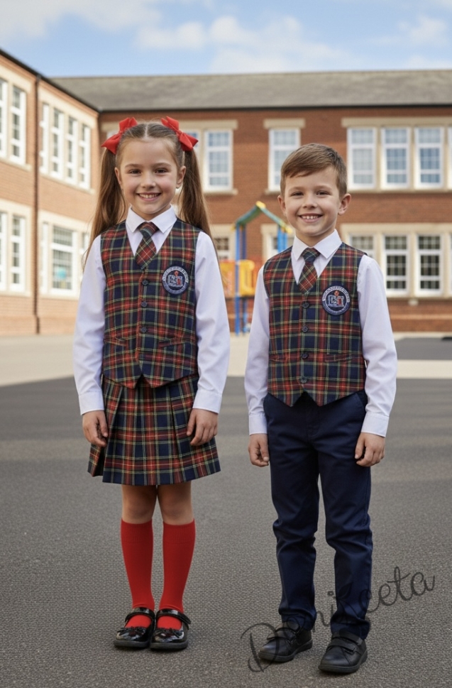 Начало УЧЕНИЧЕСКИ УНИФОРМИ Комплект каре от 3 части- карирана плисирана пола леко удължена, карирана вратовръзка и карирано елече с лого, подходящ и за ученическа униформа
