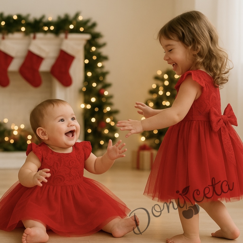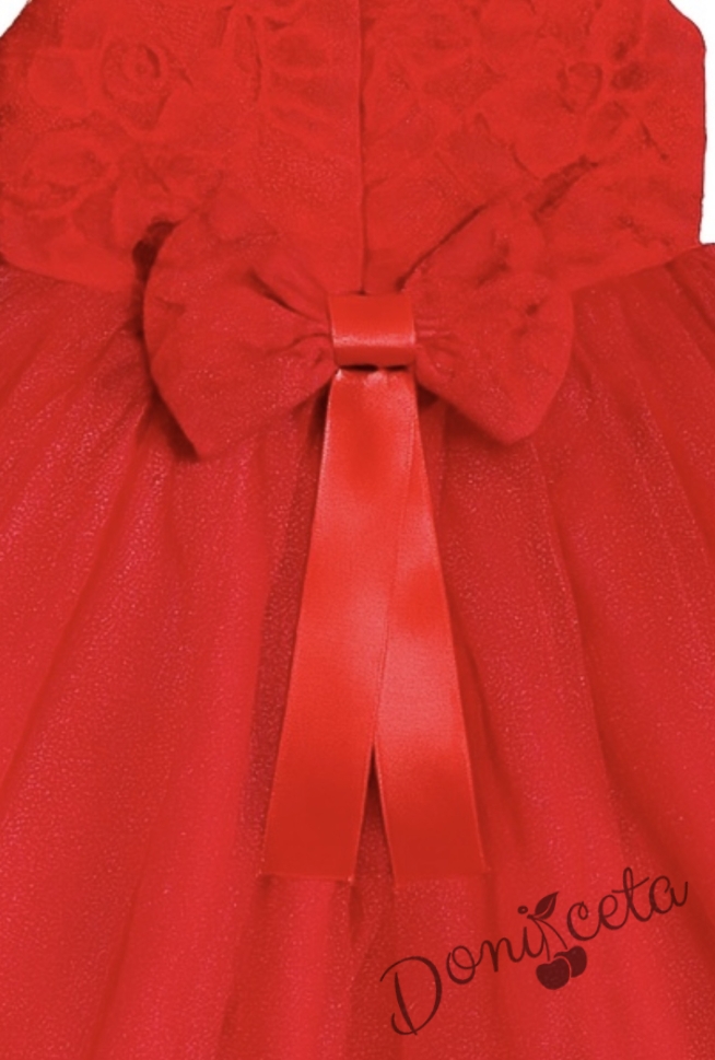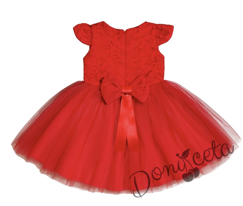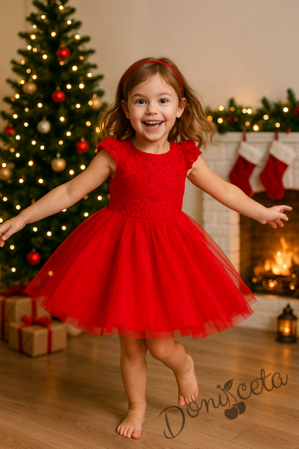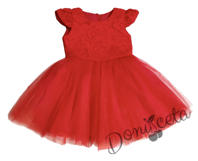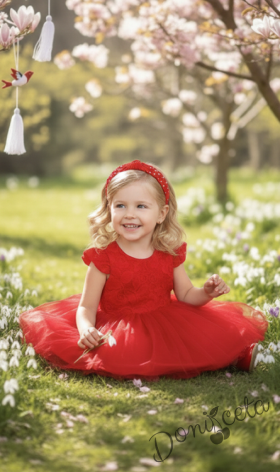 Детска рокля в червено с къс ръкав с дантела и тюл от колекция Червеника Крис
