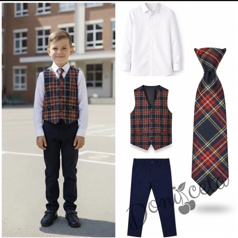 Комплект за момче от 4 части- риза в бяло, панталон в тъмносиньо, елече и вратовръзка в карирано червено, подходящ и за ученическа униформа