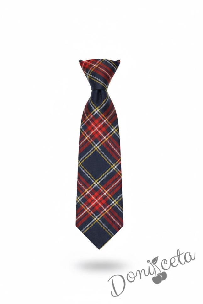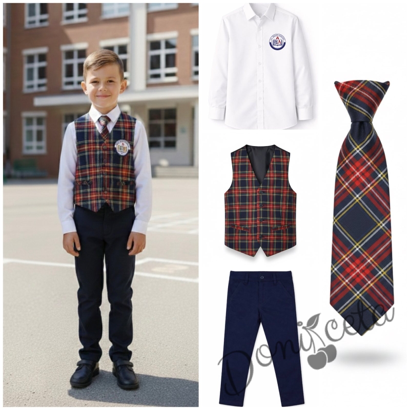 Комплект за момче от 4 части- риза в бяло с лого, панталон в тъмносиньо, елече с лого и вратовръзка в карирано червено, подходящ и за ученическа униформа