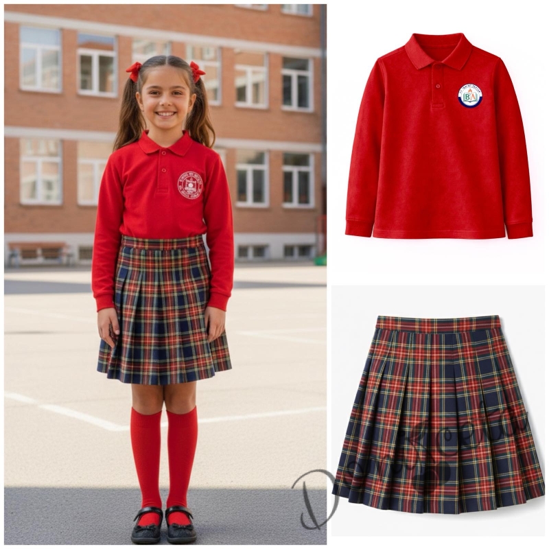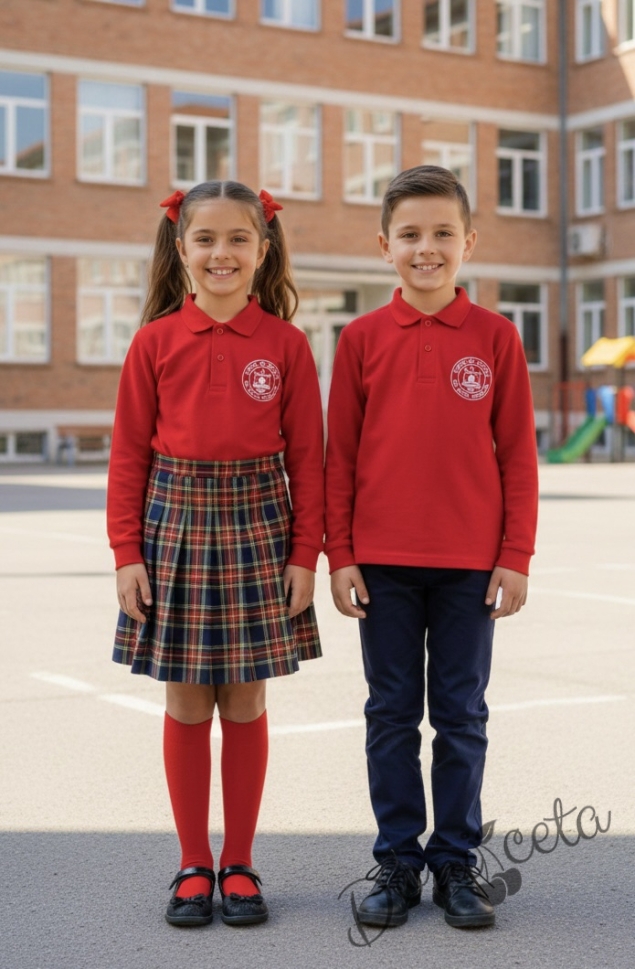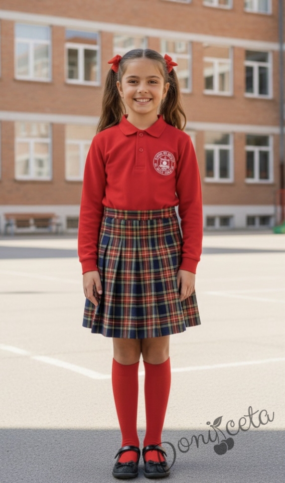 Комплект от 2 части-червена блуза с яка и лого, съчетана с леко удължена плисиран пола в червено каре, подходящ и за ученическа униформа
