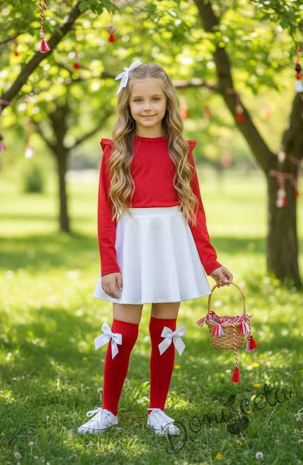 Комплект за момиче от 2 части-пола клош от трико Радост в бяло и блуза с дълъг ръкав с къдрички в червено