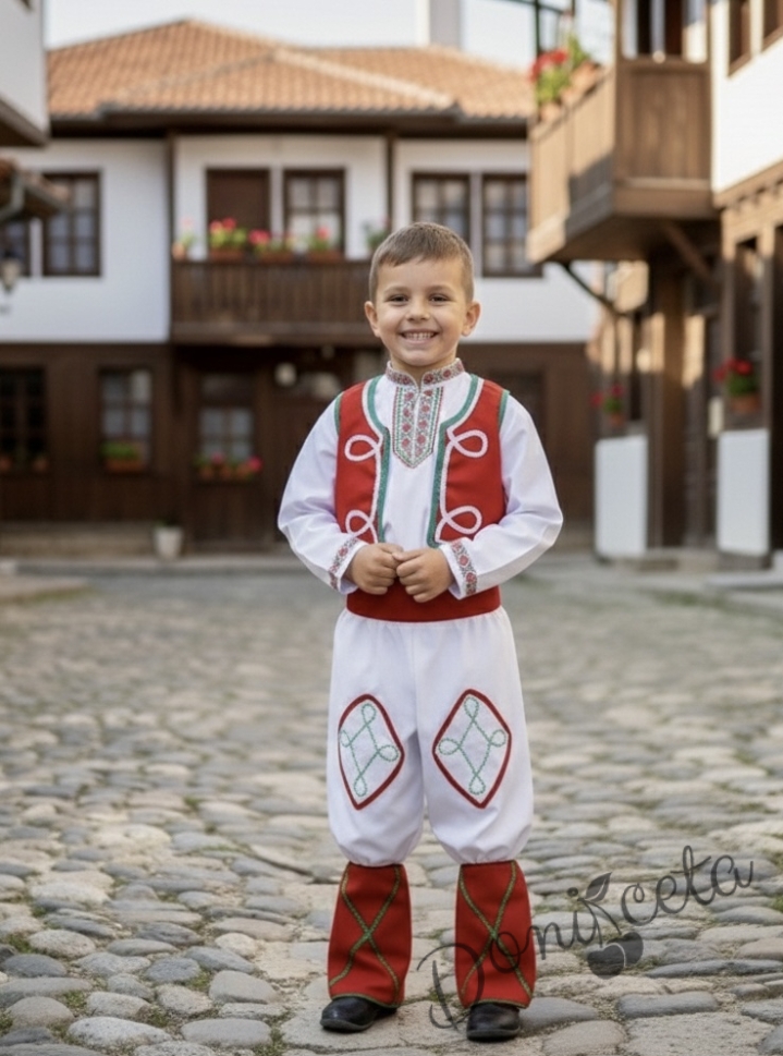 Мъжка или детска народна народна носия трибагреник за момче 98 с фолклорни/етно мотиви, с елек и пояс в червено и гети в червено