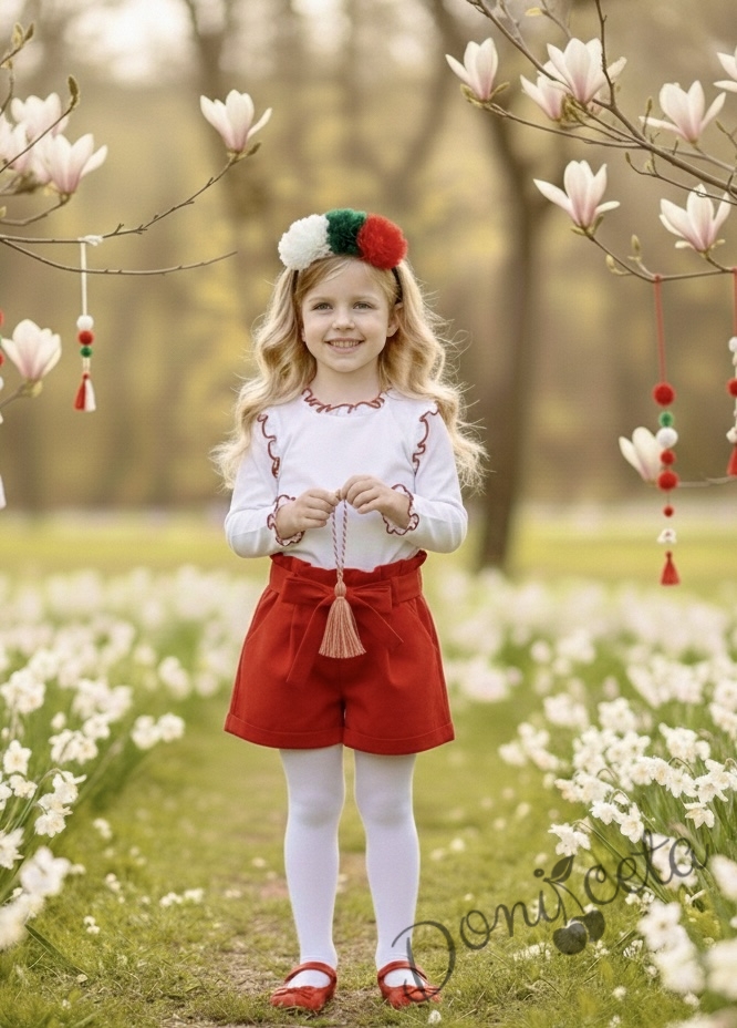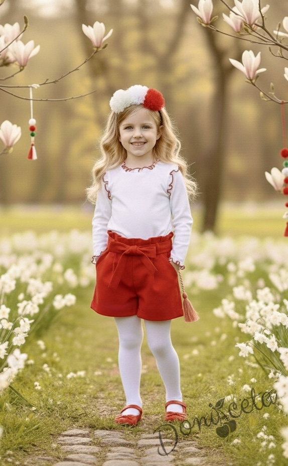 Комплект за момиче от къси панталони в червено и блуза в бяло с дълъг ръкав с къдрички обкрайчени в червено