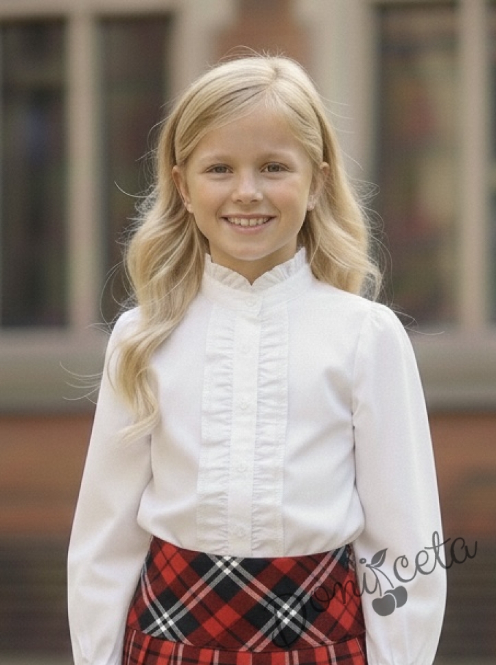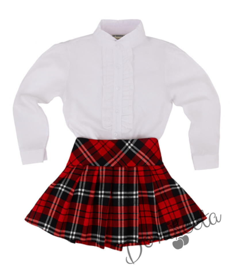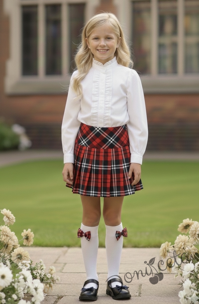 Комплект от 2 части-плисирана пола в червено и тъмносиньо и риза с дълъг ръкав с висока яка