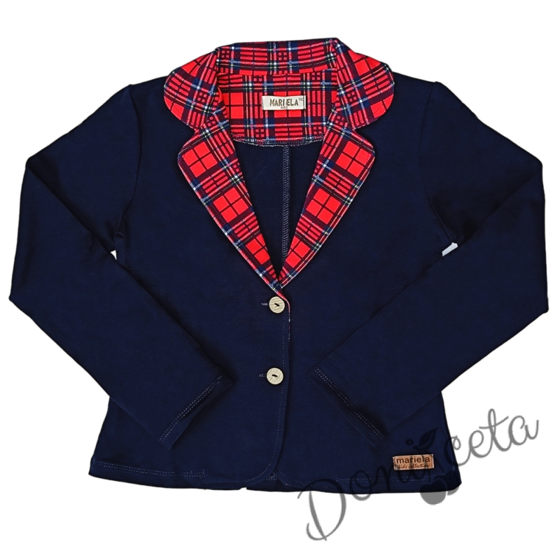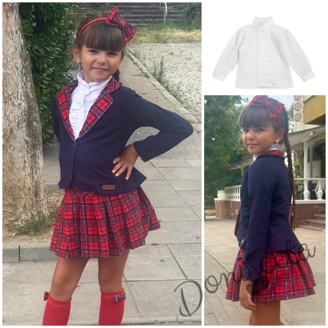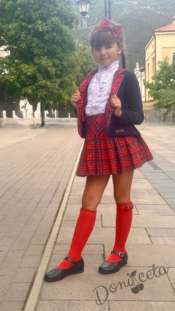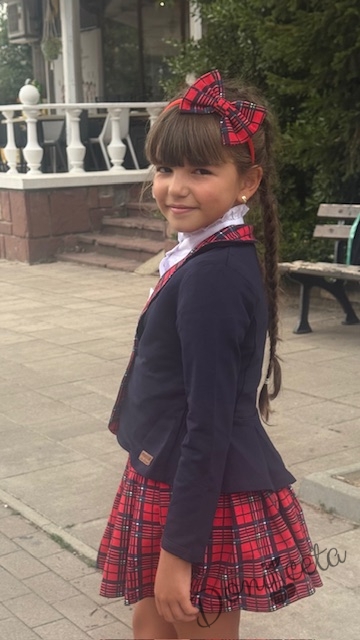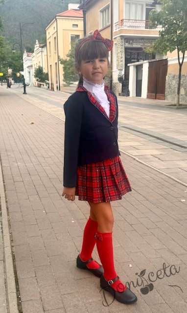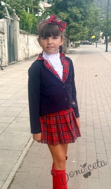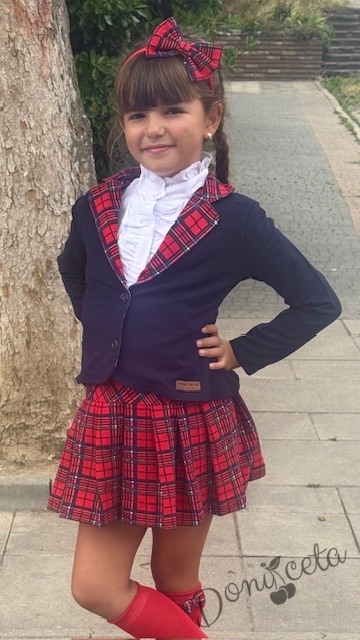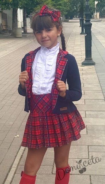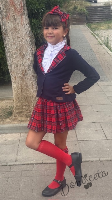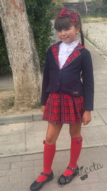 • Прекрасен комплект за момичета от пола в червено каре с ластик, елегантно сако в тъмносиньо с елементи на каре и риза с дълъг ръкав с висока яка.