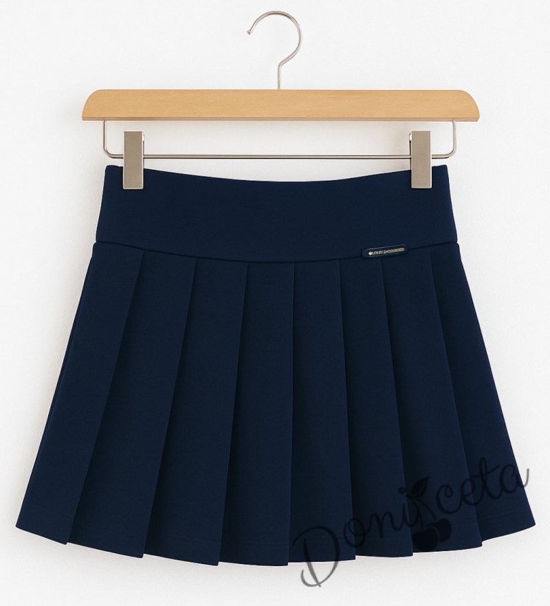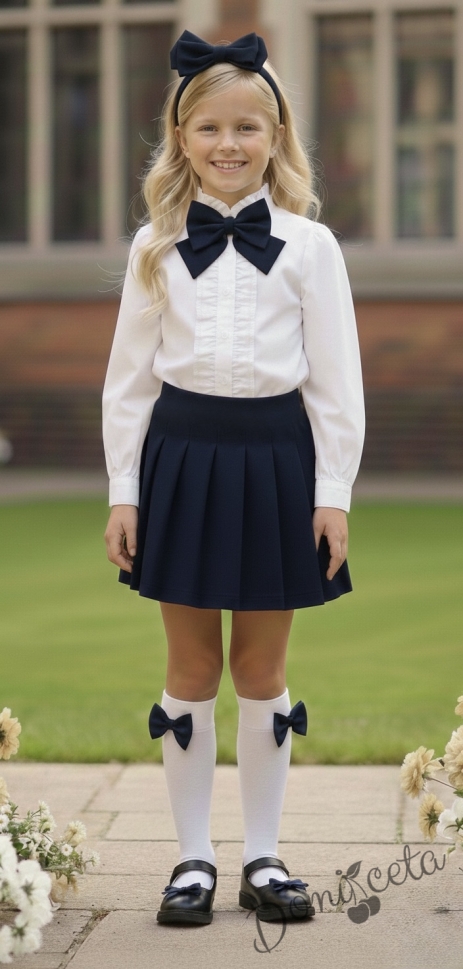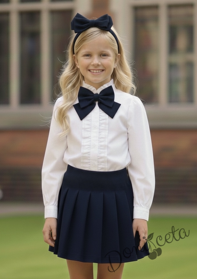 Комплект за момиче от 3 части-пола Гери в тъмносиньо, риза с дълъг ръкав в бяло с къдрички, панделка за риза в тъмносиньо