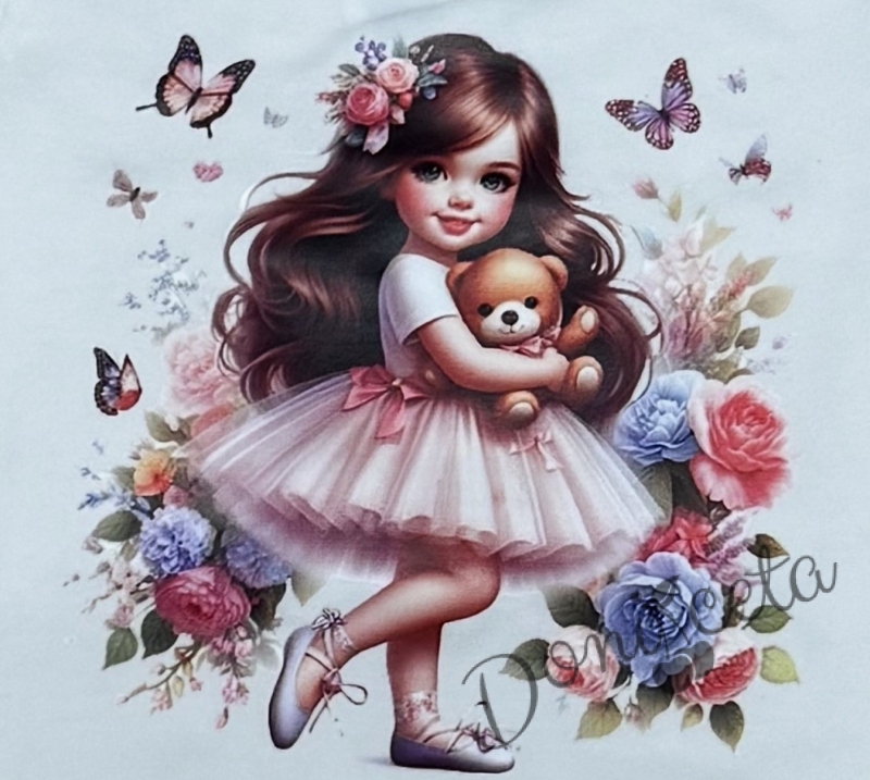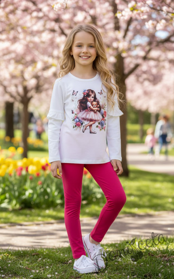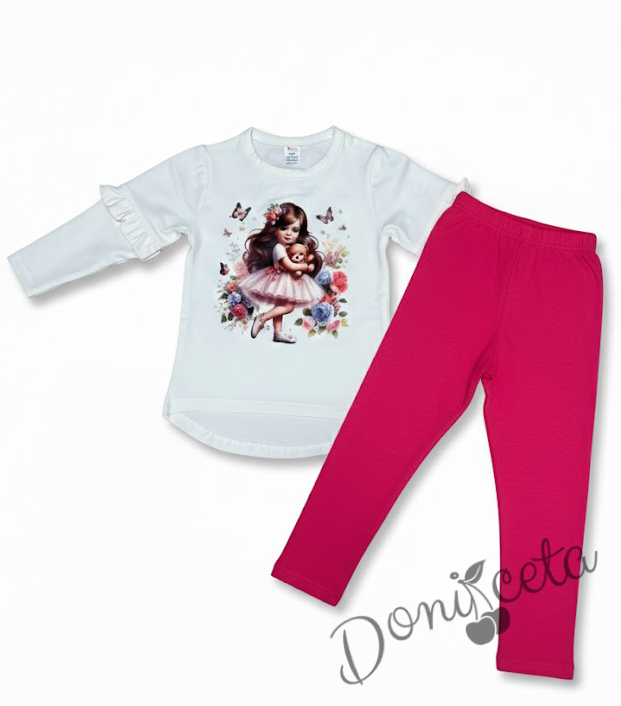 Детски комплект от две части – блуза в екрю украсена с красива и детайлна щампа на момиченце с мече, и цикламен клин
