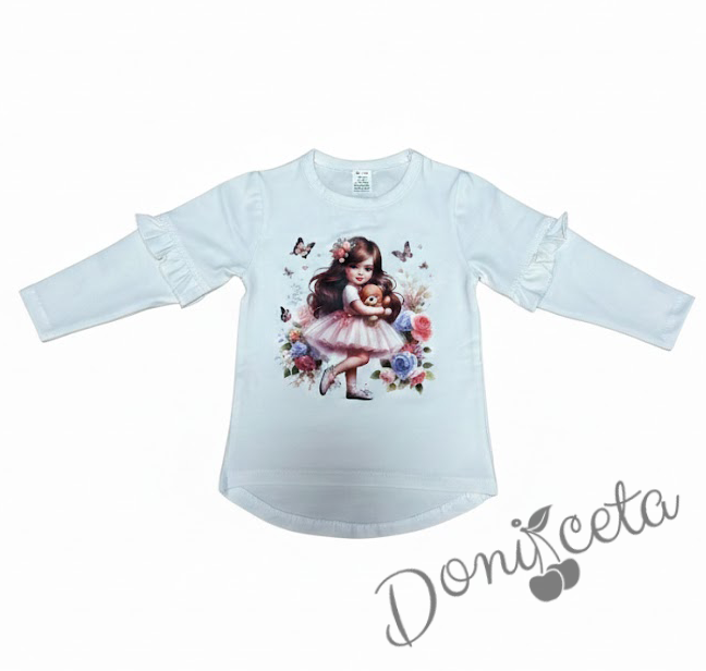 • Комплект от 2 части- блуза в екрю с дълъг ръкав и къдрички украсена с красива и детайлна щампа на момиченце с мече комбинирана с изчистен клин в ципклама.