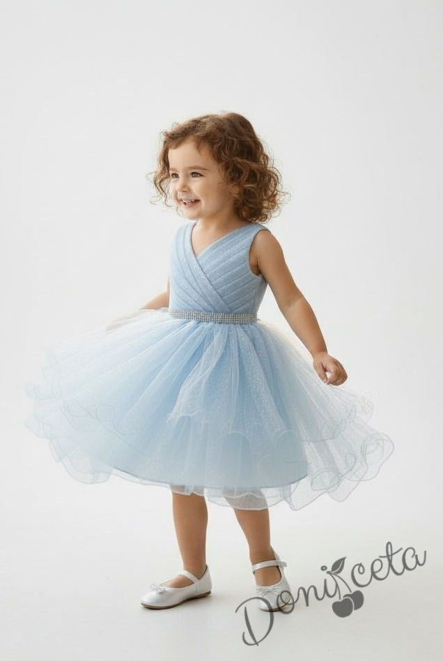 Изключително елегантна детска рокля в светлосиньо, изработена от фина материя.